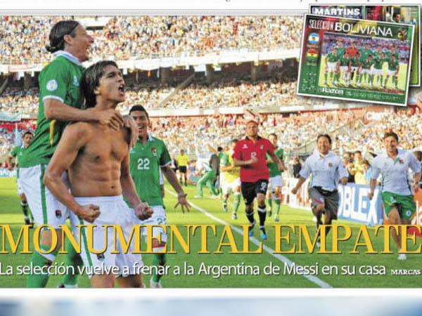 En tanto el periódico La Razón puso como título "Monumental empate" y agregó "Bolivia dio otro golpe histórico al empatar con Argentina en Buenos Aires. Mejor dicho, Argentina, la de Leo Messi, el mejor jugador del mundo, le empató a nuestra selección en el Monumental de Núñez, como ya había ocurrido hace meses en la inauguración de la Copa América".