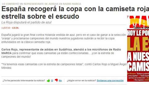 Buenos Aires, 11 de julio.- "Lo que soñamos desde niños", "Así vive La Roja su día más importante", "Toda una vida en 90 minutos" y hasta "España recogerá la copa con la camiseta roja con la estrella sobre el escudo", son algunos de los títulos con los que el diario Marca se anticipa a la supuesta corona mundialista que, dicen, le ganarán a Holanda esta tarde.