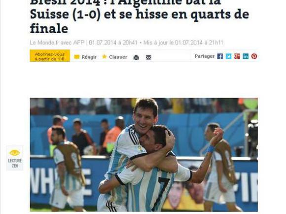 La Gazzetta dello Sport de Italia señaló: ‘Argentina avanza con emocionante gol de Di María y deja fuera a Suiza‘. En Brasil, O’Globo tituló: ‘Argentina despacha a Suiza con un gol en la prórroga, después de una jugada de Messi‘.