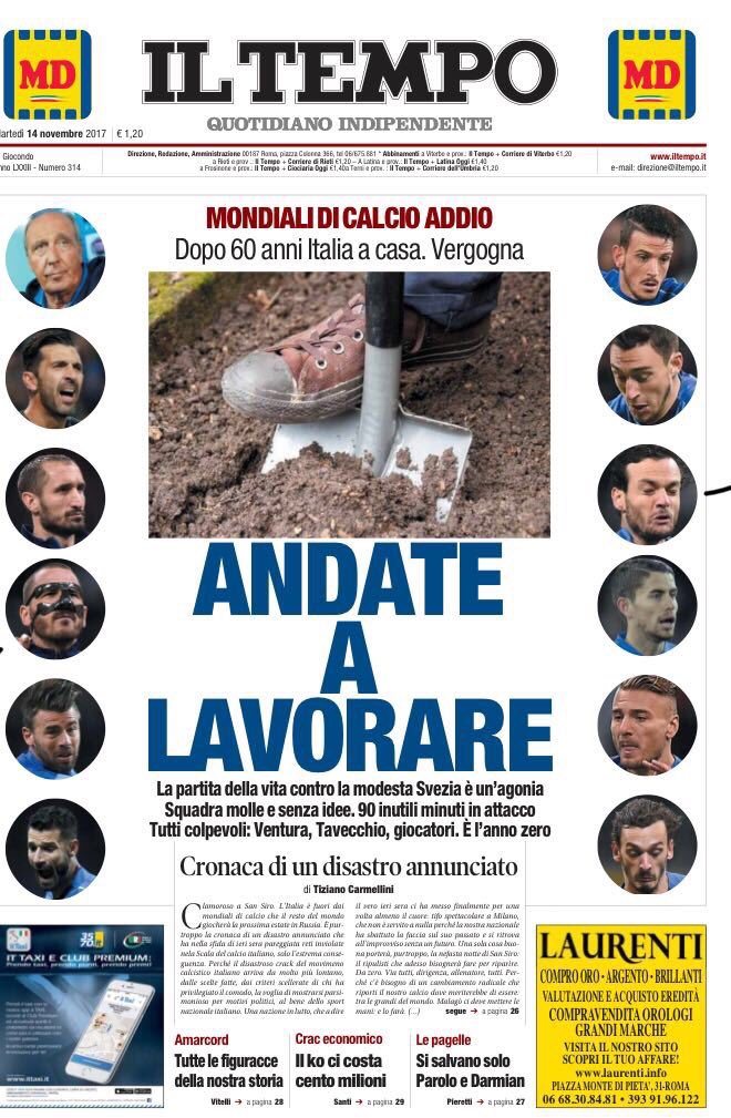 “Apocalipsis” y “vergüenza” fueron algunos de los conceptos a los que recurrieron los medios italianos para definir la eliminación. Sin embargo el más categórico fue el título principal de portada elegido por el diario romano Il Tempo: “Vayan a trabajar”. La sugerencia fue acompañada de pequeños retratos del varios futbolistas y del entrenador Gian Piero Ventura, y también de una foto con una referencia fácil de entender: el pie de una persona clavando una pala en la tierra.