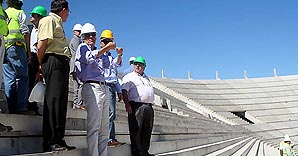 Aunque la comitiva encabezada por Julio Mariz, presidente de Traffic, la empresa brasileña encargada de la organización de la televisación de la Copa América en conjunto con la AFA, realizó ayer una visita muy breve, resultó muy provechosa para el gobierno sanjuanino porque recibió recomendaciones sobre mejoras puntuales al Estadio del Bicentenario que podrán ejecutarse sin sobresaltos y que permitirán calificar sin inconvenientes como una de las subsedes del torneo de fútbol que se disputará el año que viene. Mejorar la luminosidad del campo de juego de 1.400 luxes (unidad de medida) a 2.000 porque se necesita ese mínimo para realizar transmisiones televisivas en HD (siglas en inglés de alta definición); aumentar a cuatro la cantidad de vestuarios para equipos (para albergar una jornada doble de partidos), construir mangrullos detrás de los arcos para las cámaras de televisión y separar el ingreso de las delegaciones de fútbol con la zona de estacionamiento para los usuarios de los palcos VIP, fueron los ítems que apuntaron los visitantes y que anotó el secretario de Obras Públicas de la Provincia, Carlos Gil, quien estuvo en las obras con Mariz y compañía, además de Alfredo Derito, presidente de la Liga Sanjuanina de Fútbol y secretario del Consejo Federal de AFA, y Juan José Chica, subsecretario de Deportes de la Provincia.