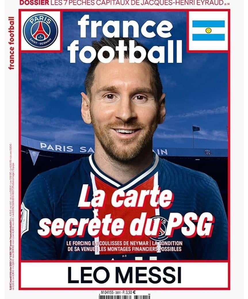 La revista France Football publicó ayer en su tapa un fotomontaje de Messi con la camiseta del PSG, especulando sobre la posible salida del crack rosarino cuando finalice su contrato con Barcelona el 30 de junio y su hipotética llegada a París.