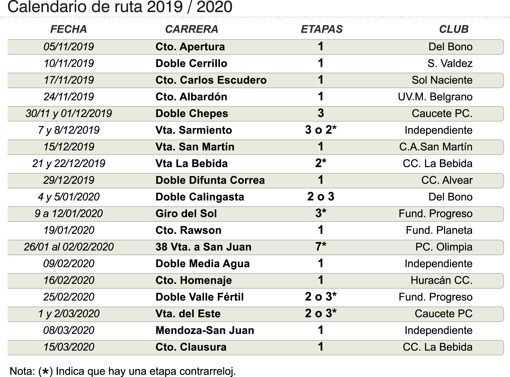 Y, si bien es cierto, se trataron de aunar criterios que piensen más en el ciclistas y que resguarden la notable y difícil tarea de los dirigentes. Los cambios son más de forma que de fondo, porque las competencias de una etapa no podrán tener menos de 140 kilómetros y solamente un par de carreras, como son el Giro del Sol y la Vuelta a La Bebida han hecho pública la reducción de algunas etapas de sus competencias. Con el nuevo criterio el Giro del Sol tendrá tres etapas y la Vuelta a la Bebida en vez de tener tres, se achicará de dos a un día con el sistema de Doble Fórmula. Las que pueden sufrir cambios pero su suerte está en "stand by" porque dependen de las respuestas de los intendentes de los distintos Departamentos donde se montan carreras como la Calingasta, la Vuelta a Sarmiento o las Vueltas del Este y la de Valle Fértil.