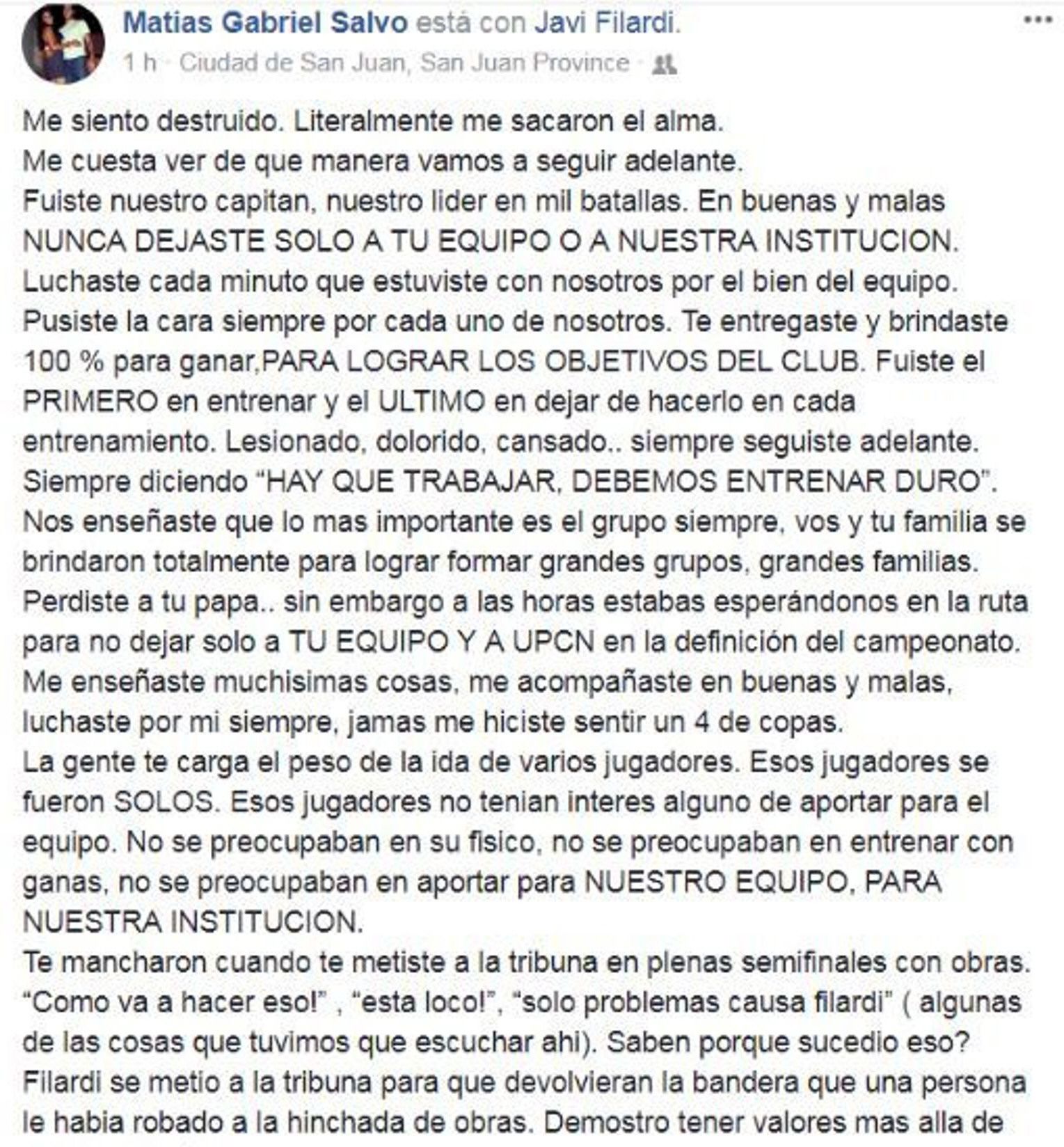 Dolido. En Facebook, Matías Salvo manifestó su dolor por la salida de Filardi.
