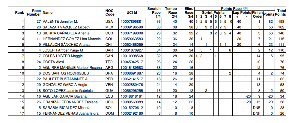 La ganadora de la prueba fue Jennifer Valente de Estados Unidos, segunda Lizbeth Salazar de México y cerró el podio Arlenis Sierra de Cuba.