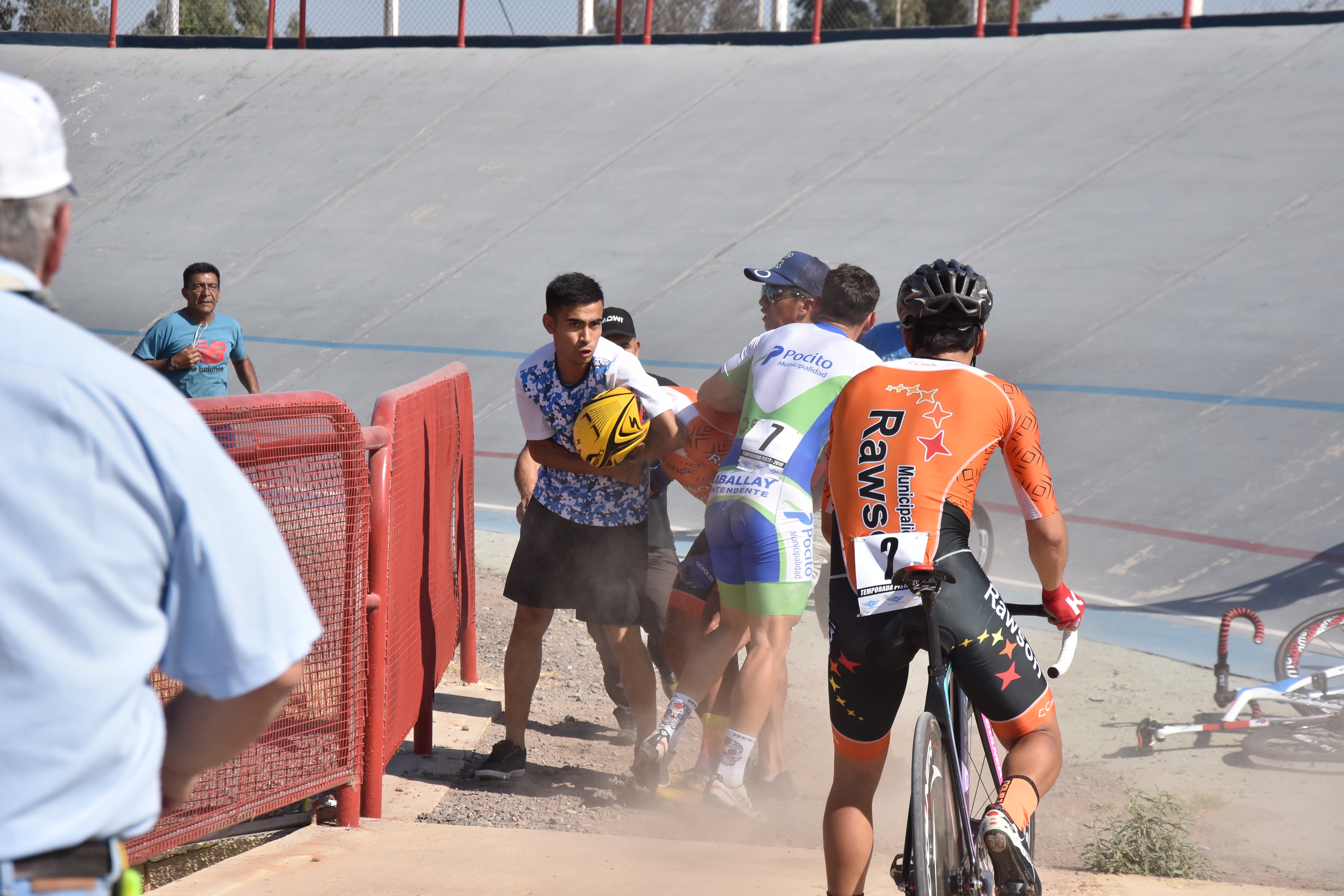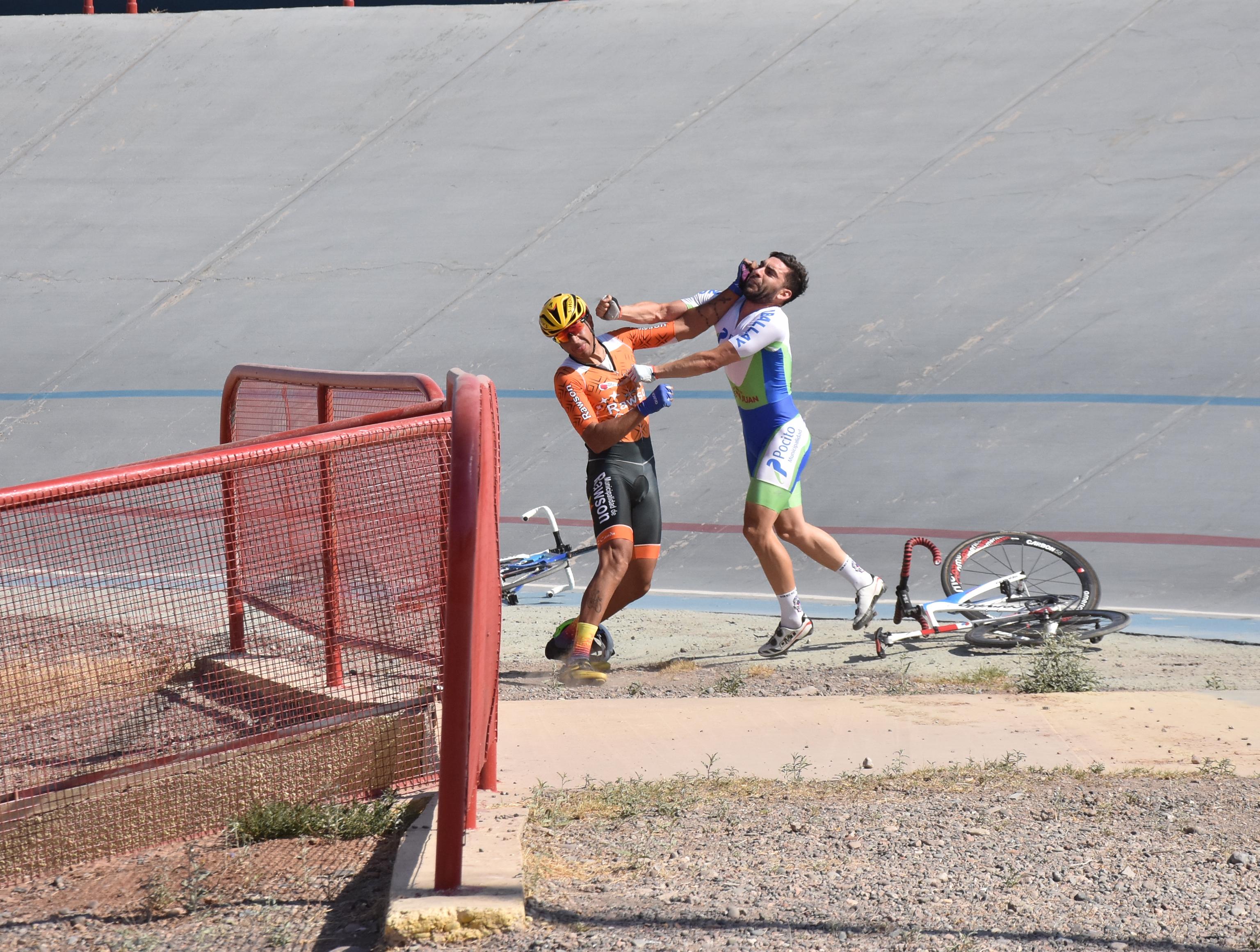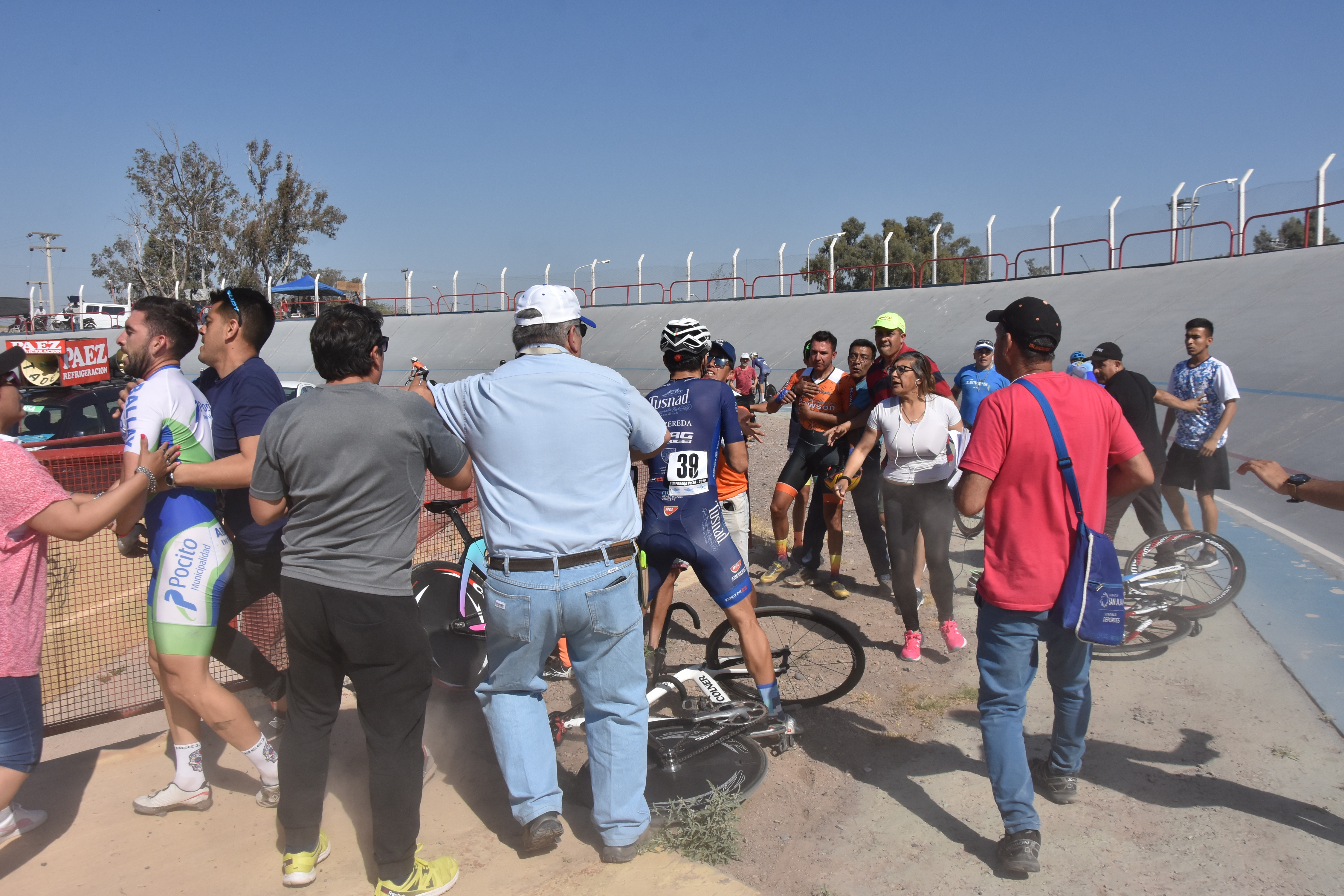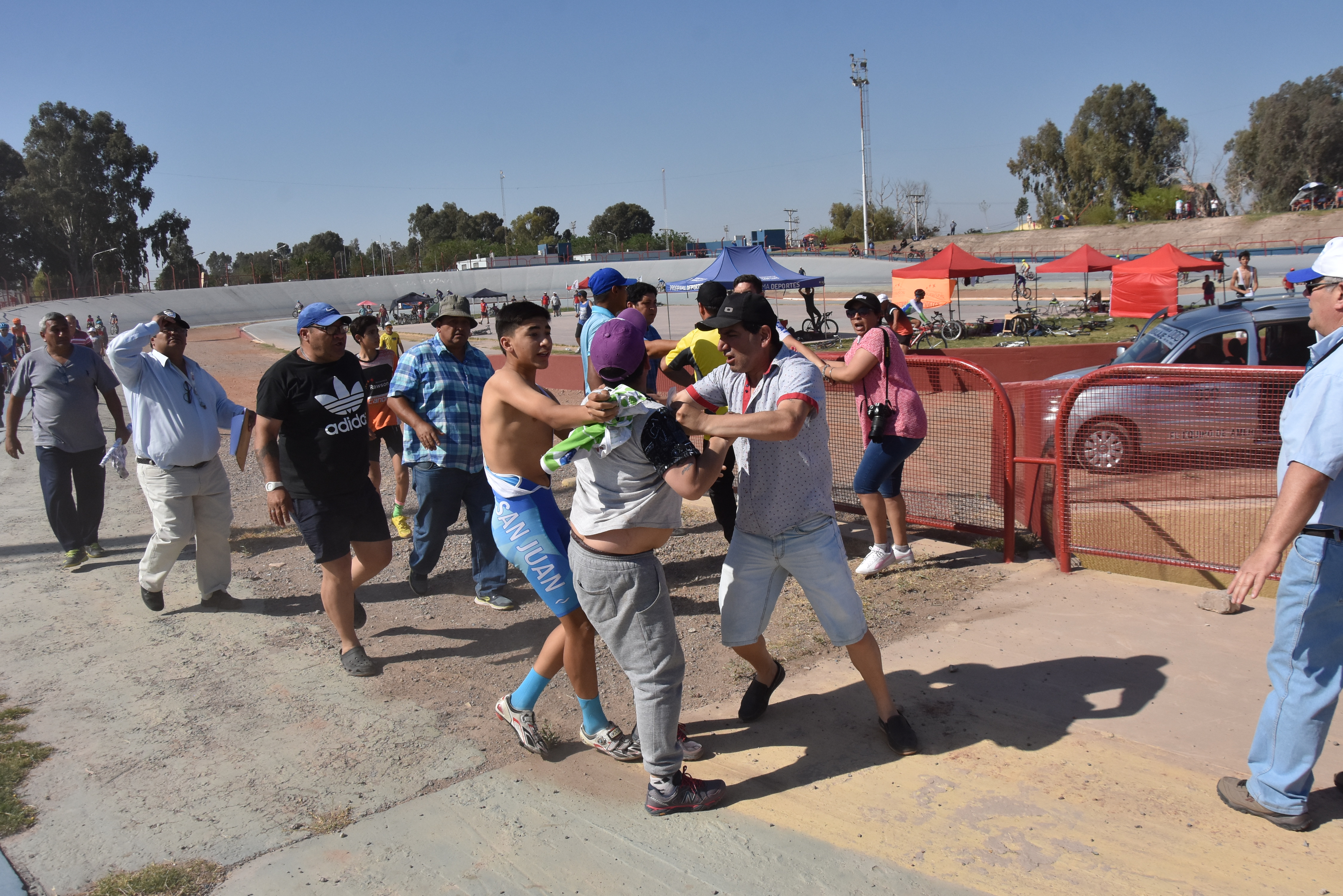 Diego Tivani y Duilio Ramos se trenzaron a golpes, generando un escándalo que incluyó a algunos personajes que nada tienen que hacer en la pista. Es más, un "espectador" le arrojó una piedra al pedalero de la Municipalidad de Pocito mientras peleaba con el de Rawson.