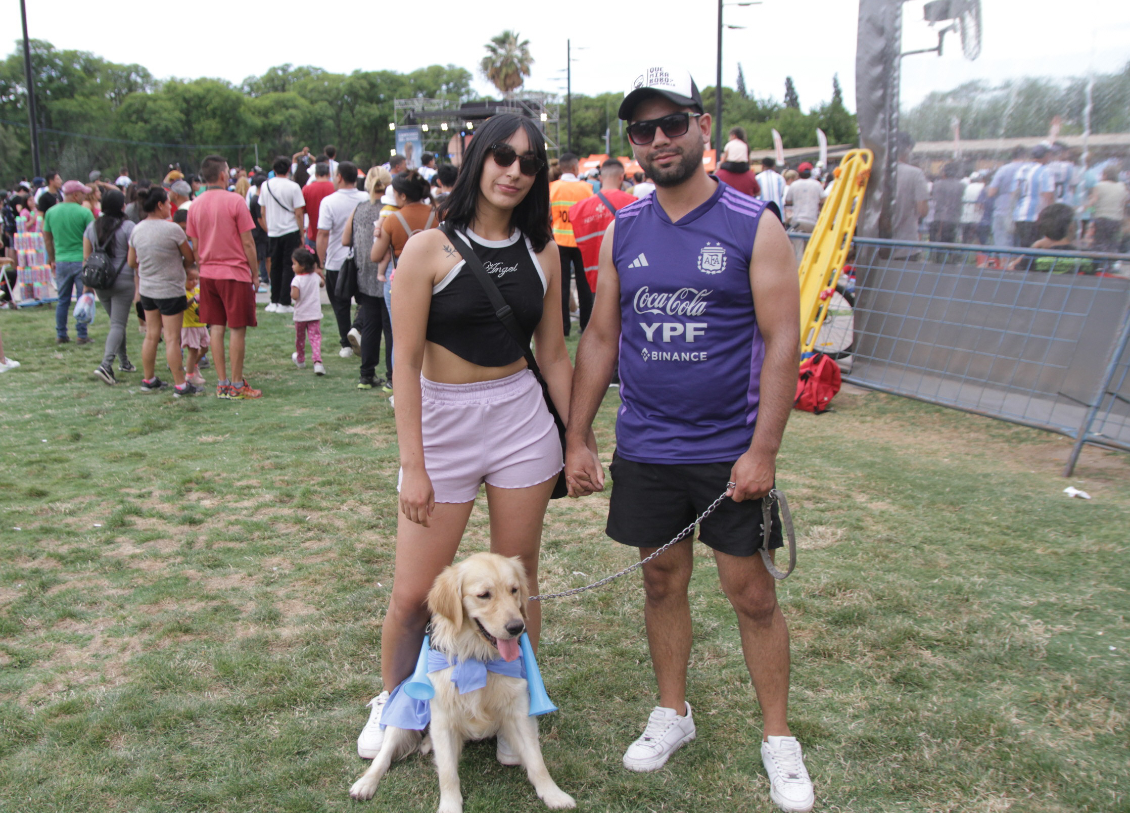 Budy, el perro fanático. Andrés y Evelin llevaron su mascota vestida de celeste y blanco. Así vivieron el Mundial y ayer no podían fallar.