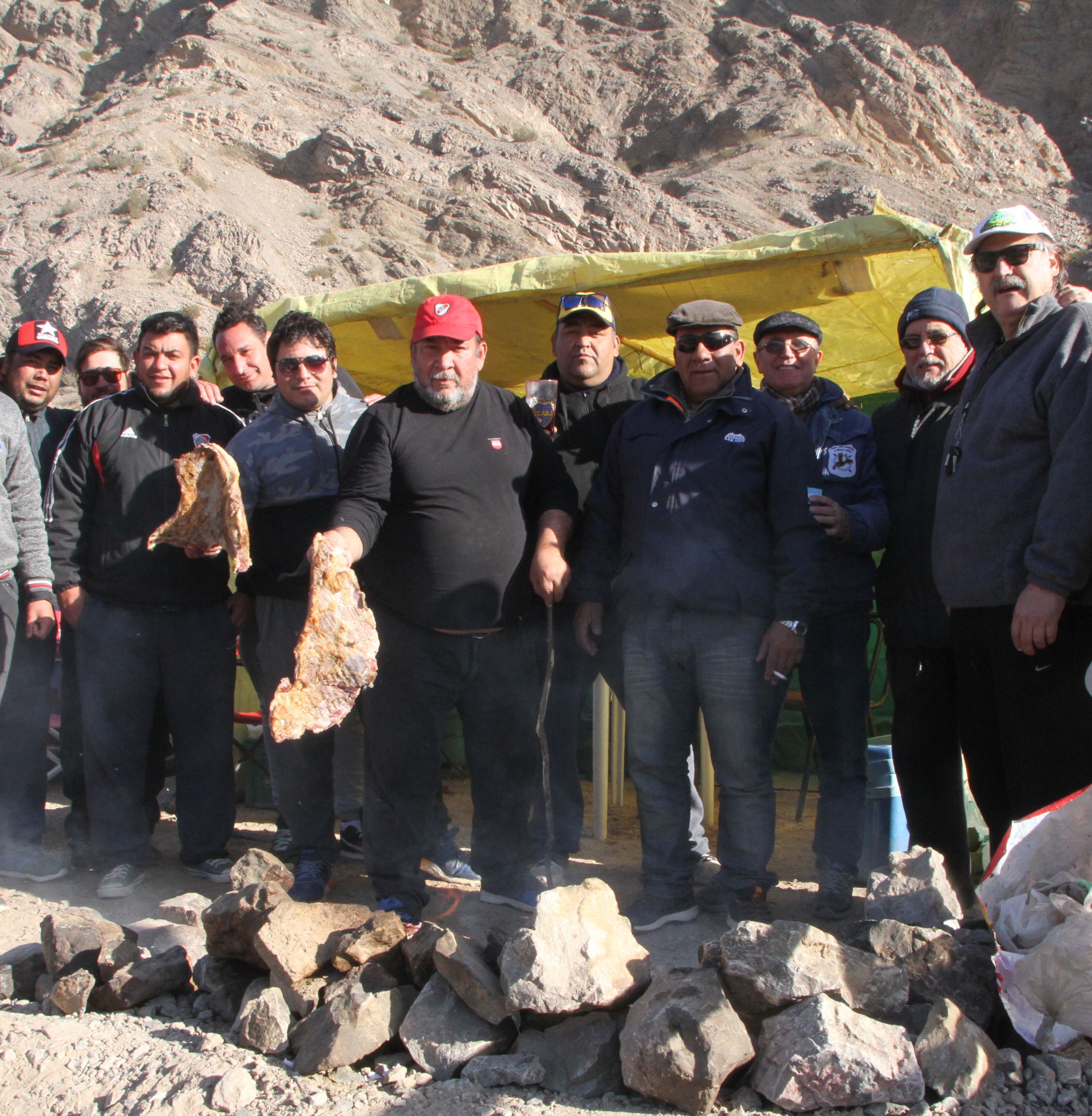 Un costillar de cerdo y punta de espalda eligieron los compañeros de una empresa de correo para hacer asado a la llama en el cerro.