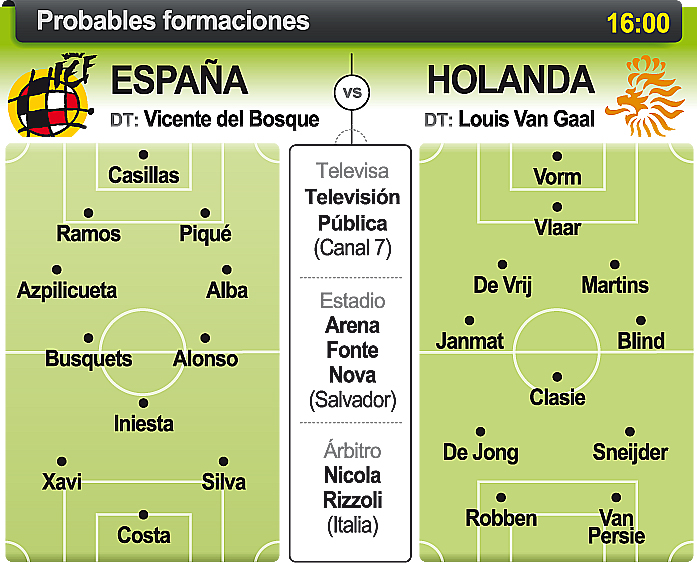 El partido entre España y Holanda, rivales de la última final en el Mundial de Sudáfrica 2010, se llevarán todas las miradas y será la gran atracción de la segunda jornada de la Copa de la Mundo 2014.