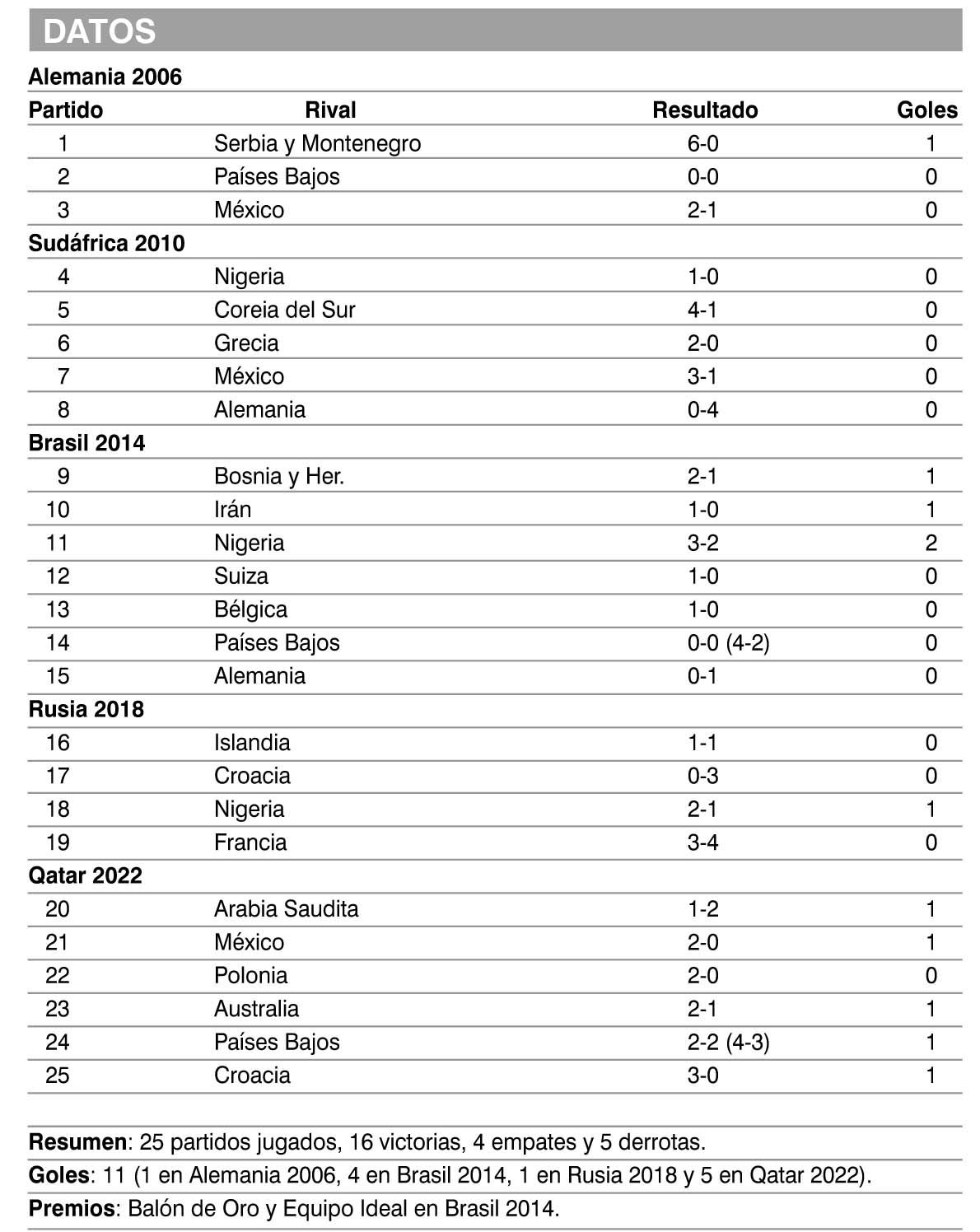 Antes de esta edición, Leo había disputado las de Alemania 2006, Sudáfrica 2010, Brasil 2014 y Rusia 2018 con diferentes sensaciones. La juventud del primero, la falta de gol en el segundo, la frustración de la final en el tercero y la decepción colectiva del cuarto no le permitieron un goce acabado.