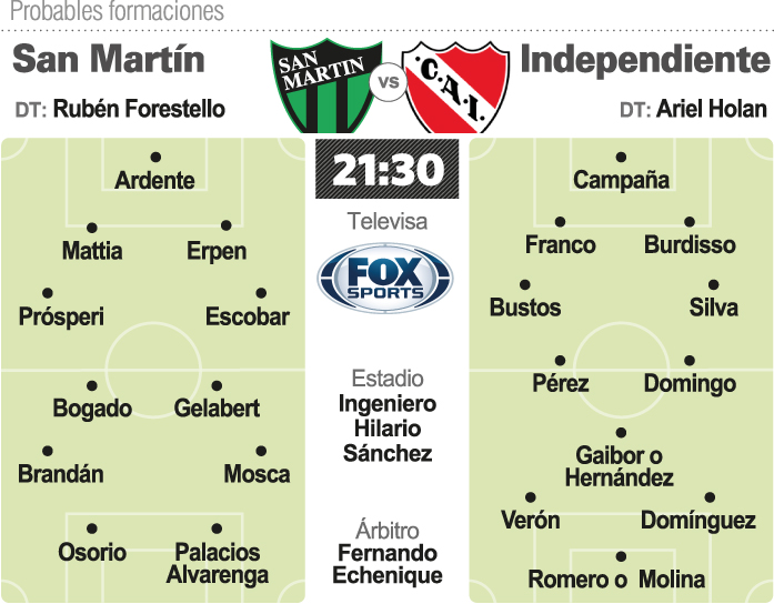 Cuando las necesidades son grandes, mantener la cabeza fría es vital. Y con ese juego de sensaciones, San Martín afrontará esta noche en su estadio uno de los partidos clave para sostener sus aspiraciones de permanencia en Primera División cuando reciba a Independiente de Avellaneda por la fecha 19 de la Superliga. Será partido de corazón caliente y mente fría para el Verdinegro que llega algo tocado por esa derrota agónica en Mar del Plata que le quitó margen en la lucha por sostener la categoría pero que no lo metió en la zona roja de los descensos. Con tres cambios y toda la ilusión de reencontrarse con el rendimiento y la contundencia que mostró hace apenas 12 días atrás contra Estudiantes, el Verdinegro de Forestello sabe muy bien que este sábado será más que decisivo.