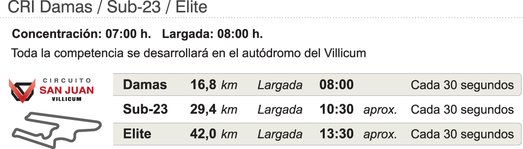 Después de idas y vueltas, de la crono escalada prevista inicialmente en Punta Negra, a la contrarreloj con trazado irregular, pero sin montaña de la Avenida de Circunvalación, elegida como segunda opción; las pruebas en solitario que abrirán la actividad de los campeonatos argentinos de ruta 2022, se llevarán a cabo en el trazado del autódromo San Juan-Villicum. La pista de 4226 metros de cuerda, será transitada en diferente cantidad de giros según las exigencias reglamentarias para cada categoría (ver infografía).