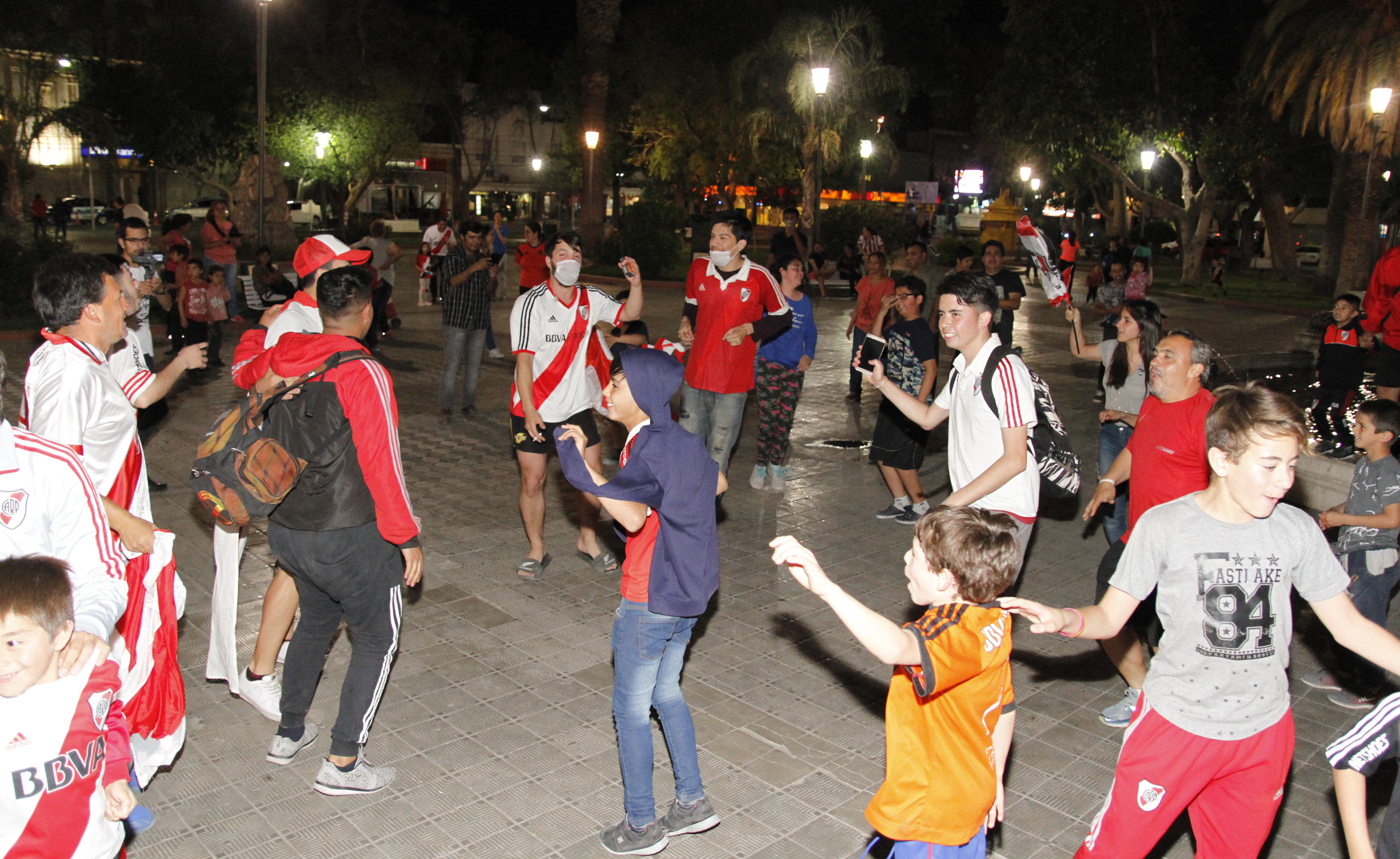 Felices. Los sanjuaninos hinchas del Millonario terminaron cantando y bailando en la principal plaza de la provincia. Un domingo de pura alegría para ellos.