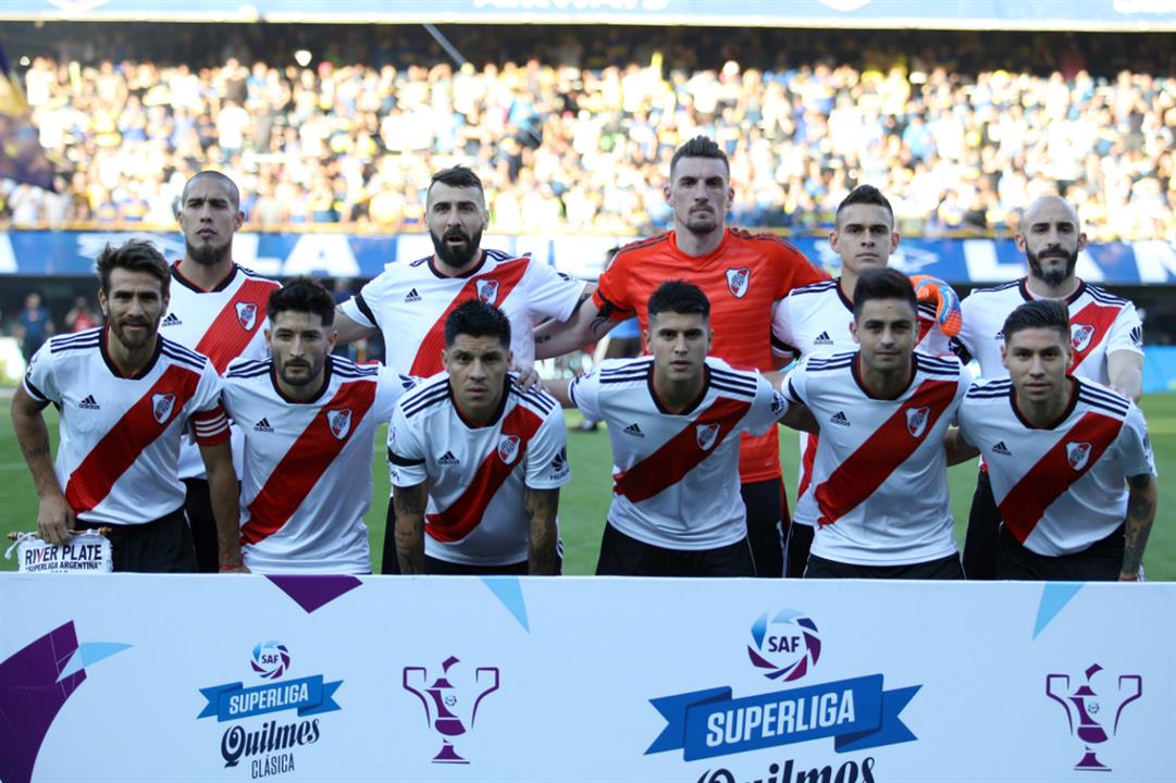 El equipo. Los jugadores de River Plate posando para la foto antes de empezar el Superclásico en la Bombonera. Después, con autoridad y determinación le ganaron con total justicia a su rival de siempre. Los goles los anotaron “Pity” Martínez y “Nacho” Scocco.