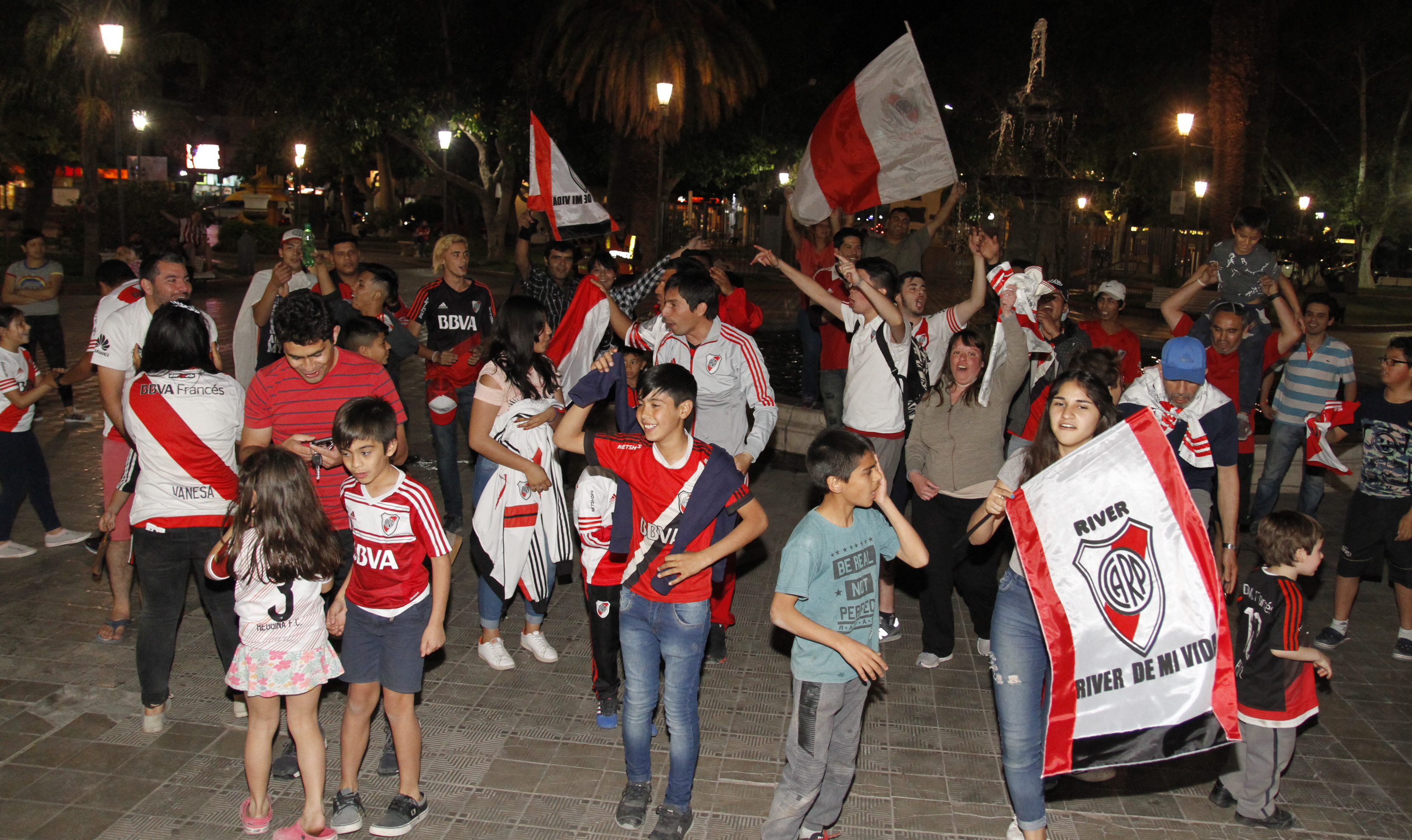 En San Juan. Apenas terminado el Superclásico, los hinchas riverplatenses sanjuaninos empezaron a llegar a la Plaza 25 de Mayo, el escenario de siempre de los festejos.