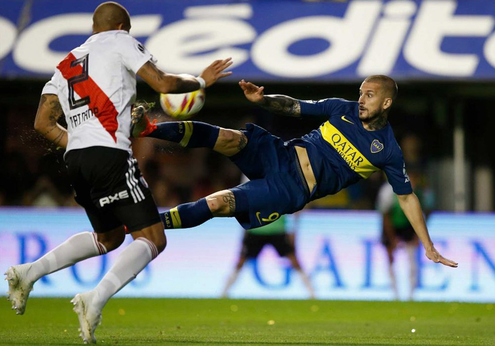 Pirueta. La que hace el delantero de Boca Darío Benedetto ante un defensor rival. El "9" estuvo cerca del marcador en un par de ocasiones pero no pudo. Después fue reemplazado.