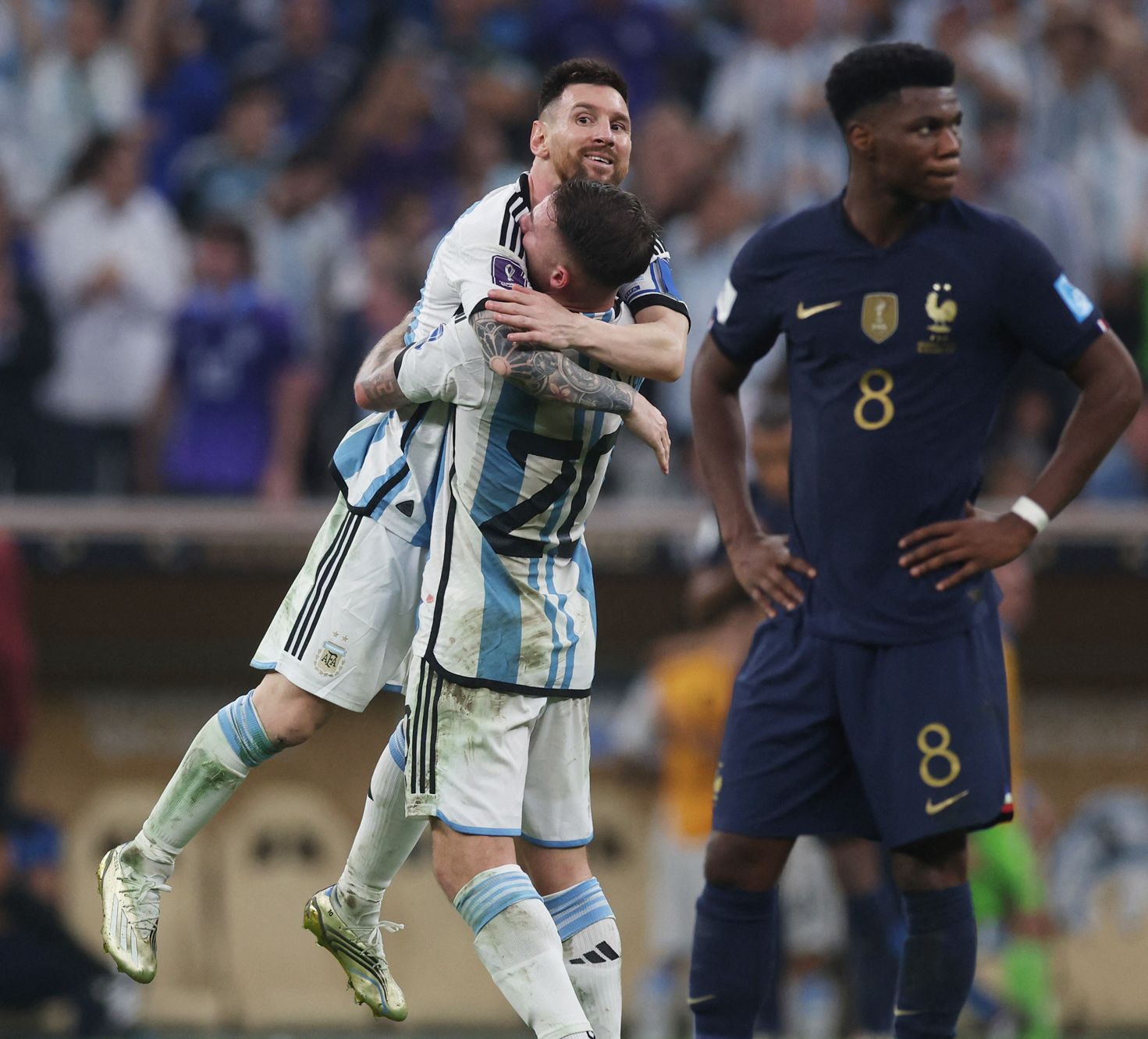 Dos caras. Lionel Messi festeja con Alexis Mc Allister mientras Aurelien Tchouameni lo sufre. Fueron los mejores momentos de la Argentina.