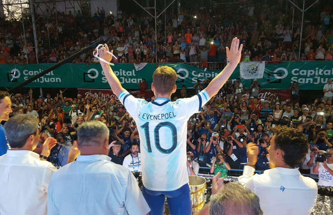 Con la 10. Con la camiseta argentina que le regaló Chiqui Tapia, Remco Evenepoel festejó a lo grande en el podio definitivo de la Vuelta a San Juan.