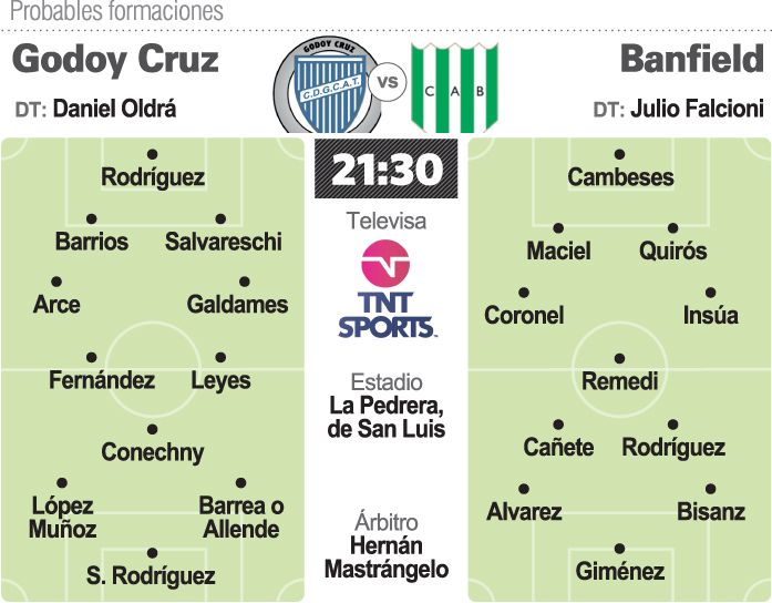 Godoy Cruz Antonio Tomba de Mendoza se enfrentará mañana a Banfield en el estadio La Pedrera, de San Luis, por los cuartos de final de la Copa de la Liga Profesional de Fútbol (LPF).