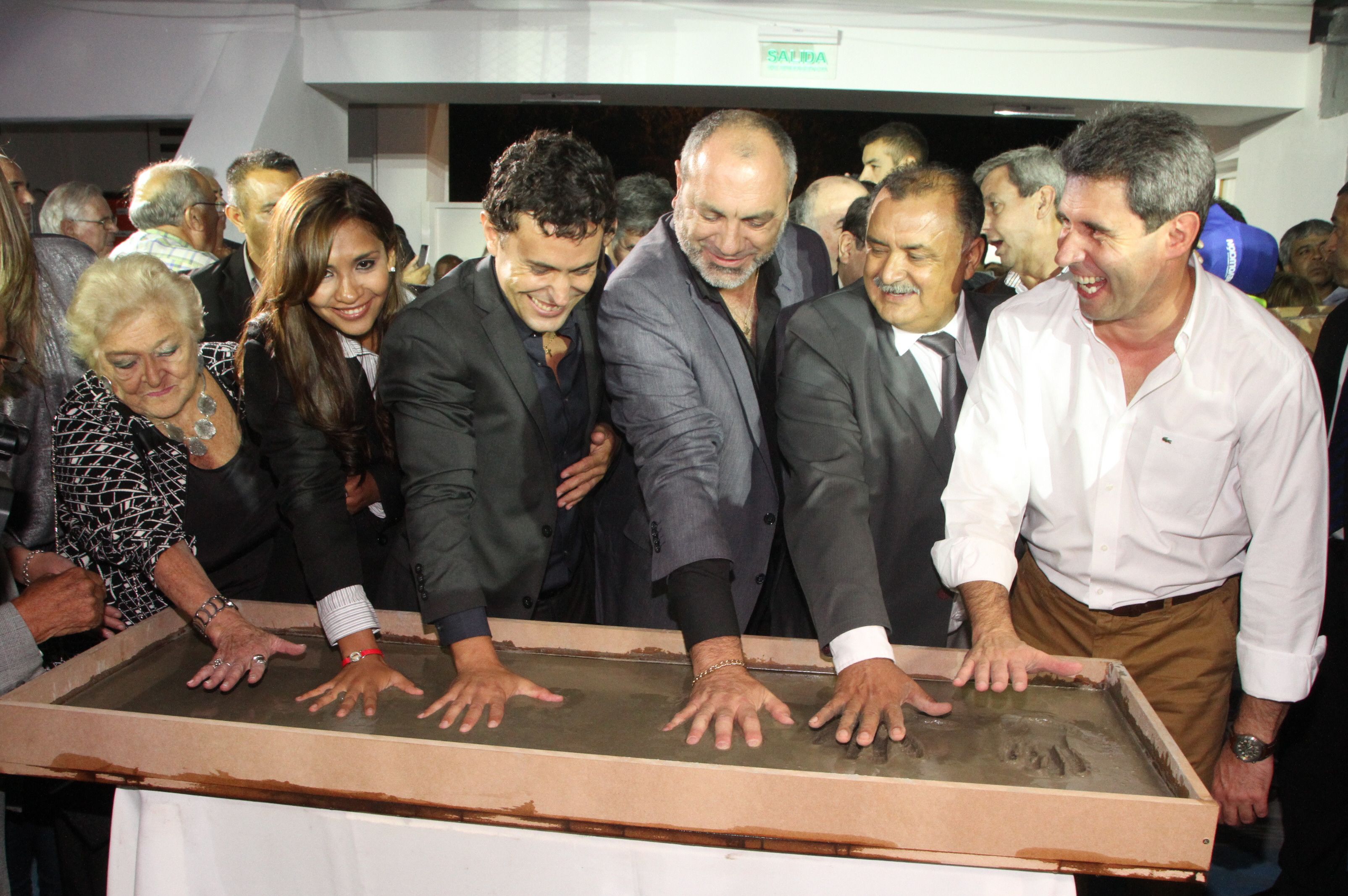 Uñac, Sosa (presidente), Ortíz Andino (ministro), Chica (secretario), Leonela Yúdica y la hija de Mocoroa, Hebe, dejan el recuerdo sobre el cemento.