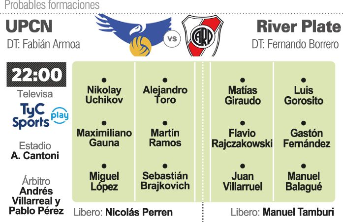 Los Cóndores son los que, a priori, tienen un sendero más allanado a semifinales. La semana pasada obtuvieron un valioso triunfo como visitantes por 3 a 0 y a ese resultado lo rubricaron con un destacado rendimiento individual y colectivo, que lo mantienen como favorito a quedarse con el cruce. River intentó ser agresivo en el inicio de cada set, pero luego la regularidad de juego y la potencia de ataque de los sanjuaninos les dio la victoria en cada parcial, para imponerse consecutivamente 25-21, 25-20 y 25-18. Es decir, fueron resultados amplios a favor de los sanjuaninos, que también son favoritos desde las estadísticas. Sucede que en el historial entre ambos, UPCN ganó 12 de 13 partidos; a la vez que Los Cóndores no se pierden una semifinal desde la temporada 2008/09 por lo que ya jugaron esta instancia en las últimas 11 ediciones de Liga.