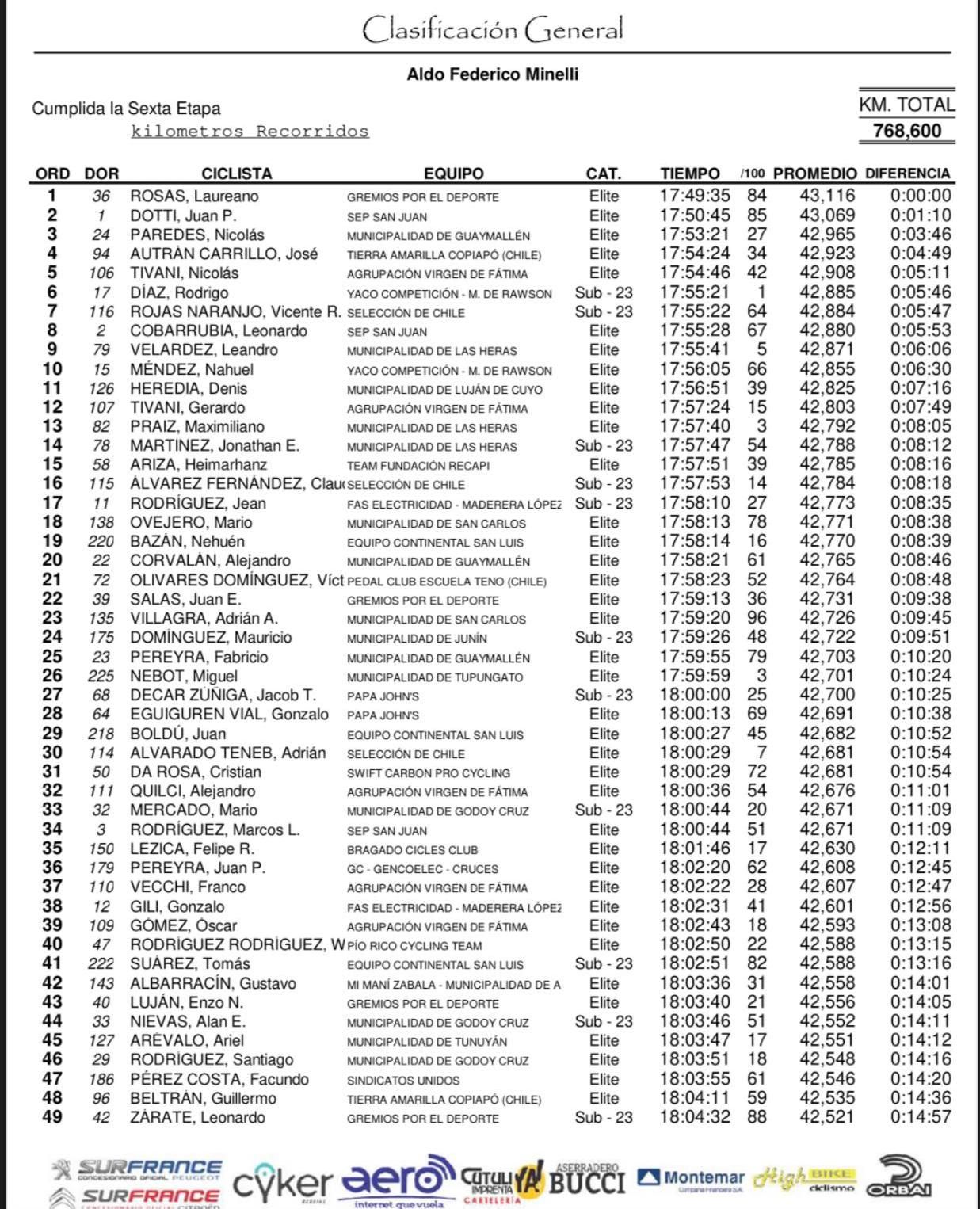 El ganador de la carrera que partió desde Uspallata y finalizó en el Cristo Redentor, fue Wilber Rodríguez (Pico Rico), mientras que el líder Laureano Rosas (Gremios por el Deporte) fue segundo y Juan Pablo Dotti (Sindicato de Empleados Públicos) fue tercero.