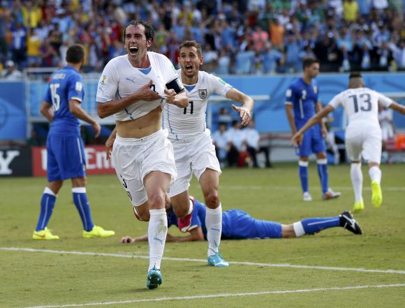 El zaguero de Atlético de Madrid saltó más alto que todos y, con un envío "mitad de cabeza-mitad hombro", le entregó el triunfo y clasificación a Uruguay. A esa altura, la Italia de Césare Prandelli, que terminó la zona con 3 puntos y quedó eliminada por segunda vez consecutiva en primera ronda de un Mundial, jugaba con diez hombres, como consecuencia de la tarjeta roja que recibió el mediocampista Claudio Marchisio, a los 14m. del segundo período.
