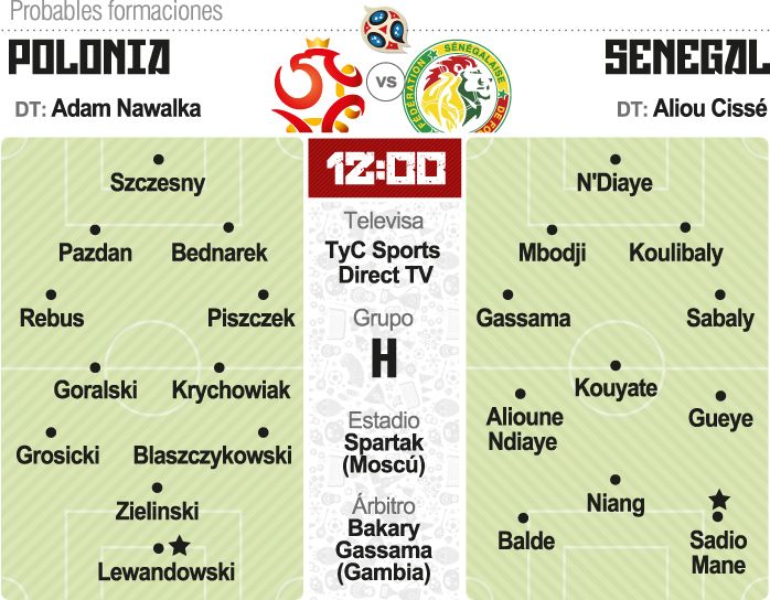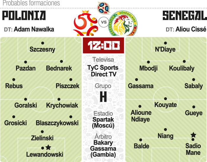El seleccionado de Polonia, liderado por el delantero Robert Lewandowski, quien tendrá su estreno mundialista a los 29 años, enfrentará hoy a su par de Senegal por la primera fecha del grupo H del Mundial de Rusia.