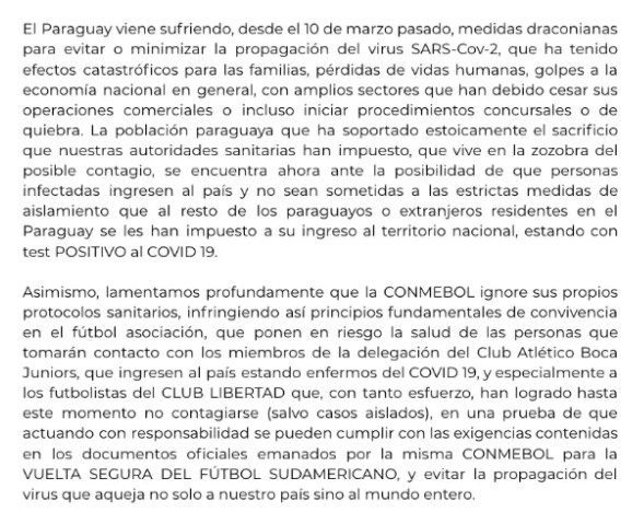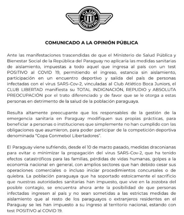 A través de un comunicado que se viralizó rápidamente en las redes sociales, el club Libertad demostró su total repudio a la decisión de la Conmebol de dejar que Boca pueda viajar a Paraguay con jugadores con Covid-19.