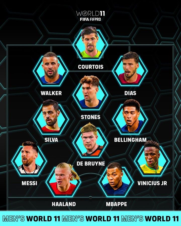El 11 Ideal completo está conformado por Thibaut Courtois; Kyle Walker, John Stones, Ruben Dias; Bernardo Silva, Jude Bellingham, Kevin de Bruyne; Erling Haaland, Kylian Mbappé, Lionel Messi, Vinicius Júnior.