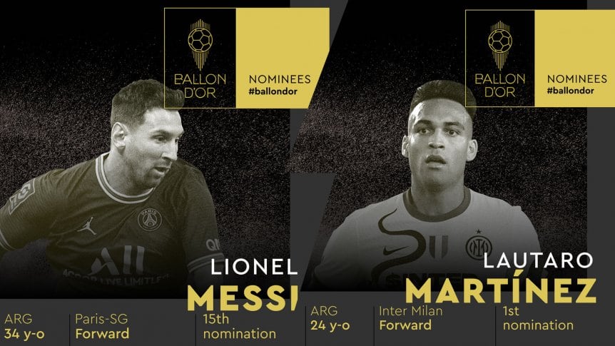 La prestigiosa revista France Football develó a los 30 futbolistas que optarán por el Balón de Oro, elegidos según el voto de 180 periodistas de todo el mundo. La gran noticia es que los argentinos Lionel Messi, el máximo ganador de la historia con seis trofeos, y Lautaro Martínez, por primera vez, figuran en la nómina.
