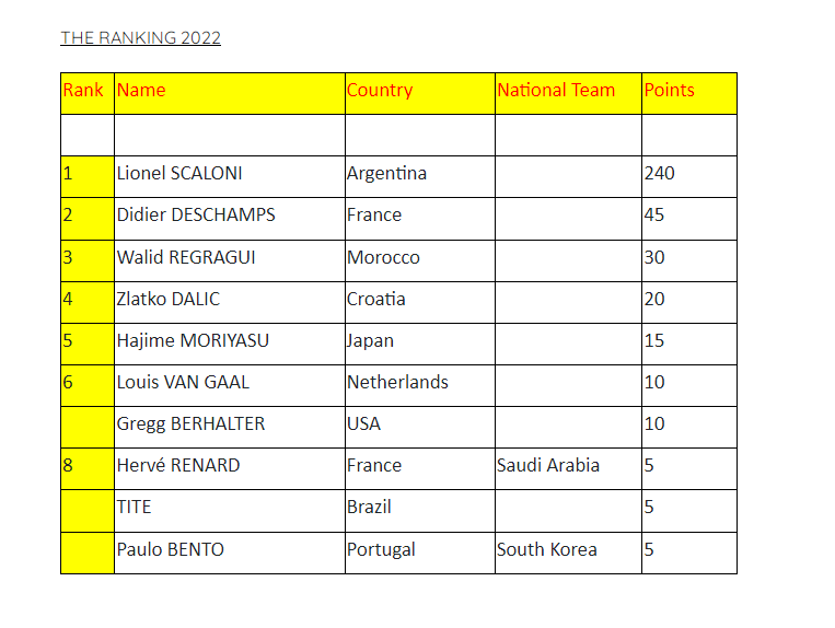 El DT de Francia, Didier Deschamps quedó segundo con 45 puntos. Mientras que en el tercer puesto aparece Walid Regragui, el técnico de Marruecos con 30 y se convirtió en el primer africano en subirse al podio.