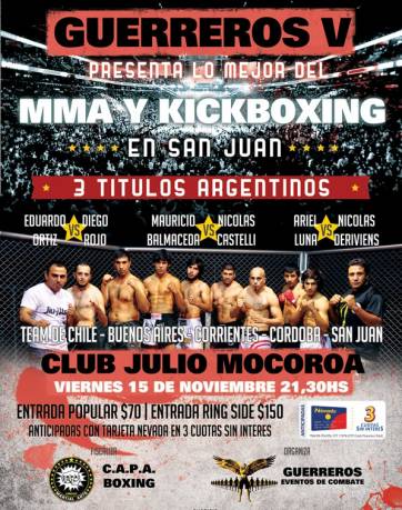 Es que desde las 18.30, en la sucursal de Tarjeta Nevada de Avenida Libertador y Tucumán, se realizará el pesaje de todos los competidores que animarán las tres peleas profesionales de MMA (Vale todo) y las ocho de kick boxing. Se espera la presencia de los peleadores sanjuaninos, como también de los mendocinos, cordobeses, correntinos y también chilenos, que se medirán mañana dentro de la jaula. La venta de entradas continúa en Nevada de calle General Acha y Mitre. Los precios: popular 70 pesos, ring side 150 pesos.