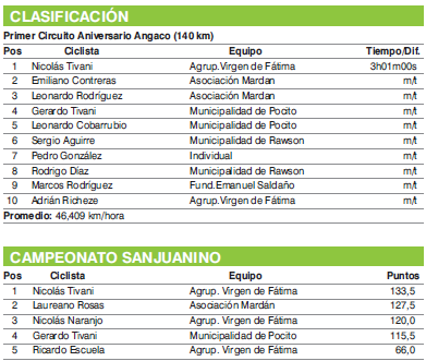 • Nicolás Tivani llegó a cuatro triunfos y se despegó de Juan Pablo Dotti (3). El pocitano ganó el Circuito Homenaje, la Vuelta a Valle Fértil, la Mendoza-San Juan y el Circuito Angaco. Además sumó una etapa en la Vuelta a San Juan y las tres en el Valle.