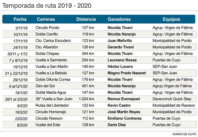 Los únicos dos ciclistas que repitieron victorias generales fueron Nicolás Tivani (4) y Nicolás Naranjo (2), los dos de la Agrupación Virgen de Fátima. Los otros diez ganadores son los siguientes: Remco Evenepoel (Deceuninck Quick-Step), Juan Melivillo, Gerardo Tivani y José Reyes (los tres de la Municipalidad de Pocito); Laureano Rosas, Emiliano Contreras y Darío Díaz (Puertas de Cuyo); Héctor Lucero y Magno Prado Nazaret (Sindicato Empleados Públicos) y; Kevin Castro (Mun. de Rawson).