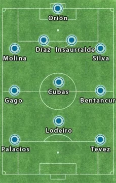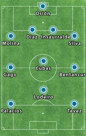 Los once: Orion; Molina, Díaz, Insaurralde, Silva; Bentancur, Cubas, Gago; Lodeiro; Palacios y Tevez.