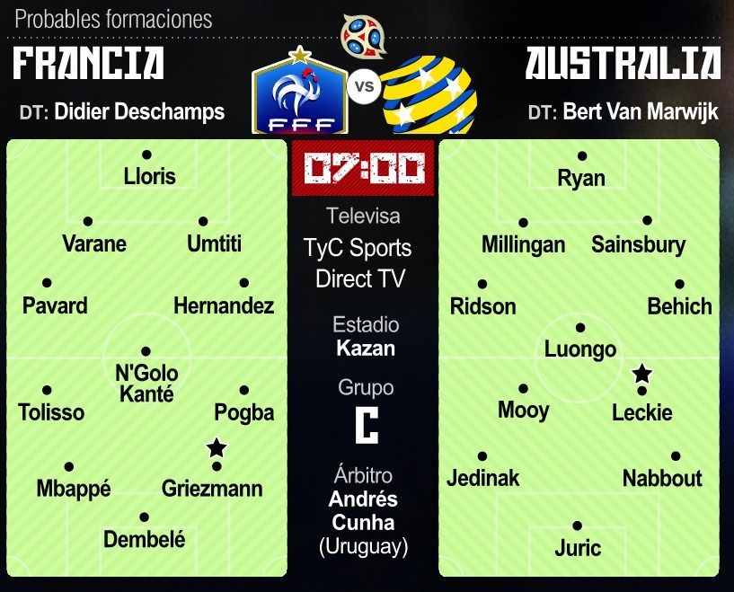 A las 7 de Argentina en el estadio Kazan Arena, con capacidad para 45.000 espectadores y con el arbitraje del uruguayo Andrés Cunha, el seleccionado francés considerado junto a Bélgica candidato a ser sorpresa se medirá con Australia, un conjunto de escasa calidad técnica pero de gran poderío físico.
