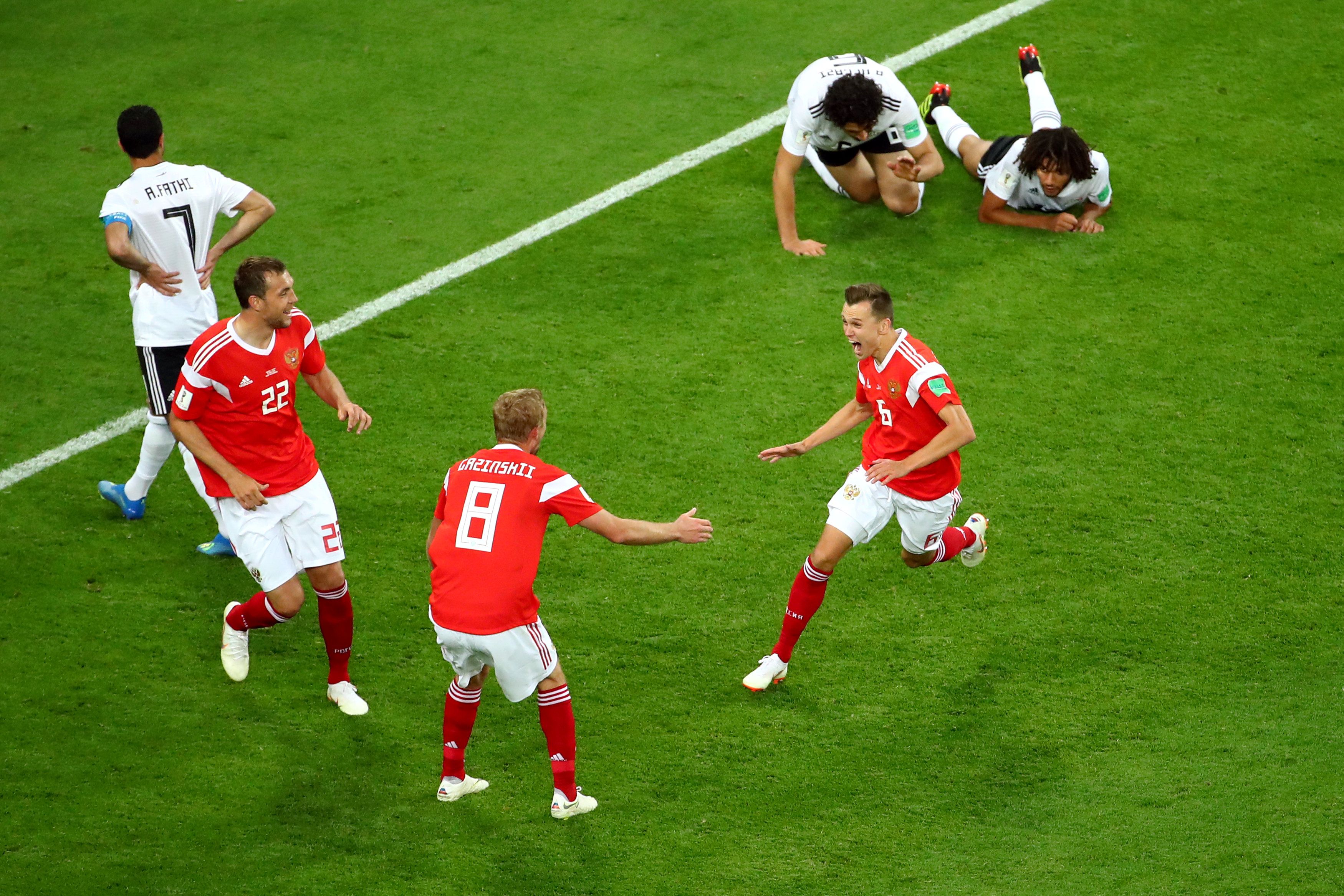 A los dueños de casa le bastaron los primeros veinte minutos del segundo tiempo para noquear por completo a los dirigidos por Héctor Cúper. Ahmed Fathi, intentado un despeje, convirtió un gol en contra cuando aún no se cumplían los 2 minutos del segundo periodo. Denis Cheryshev amplió las diferencias a los 14 minutos, tras una precisa jugada que incluyo desborde y centro atrás y Artem Dzyuba certificó la superioridad con un golazo a los 17 minutos, tras bajar con el pecho una pelota en la media luna, superar con un sutil toque por el costado la marca del zaguero Ali Gabr y someter -con un penal en movimiento- al buen guardameta Mohamed El Shenawy.