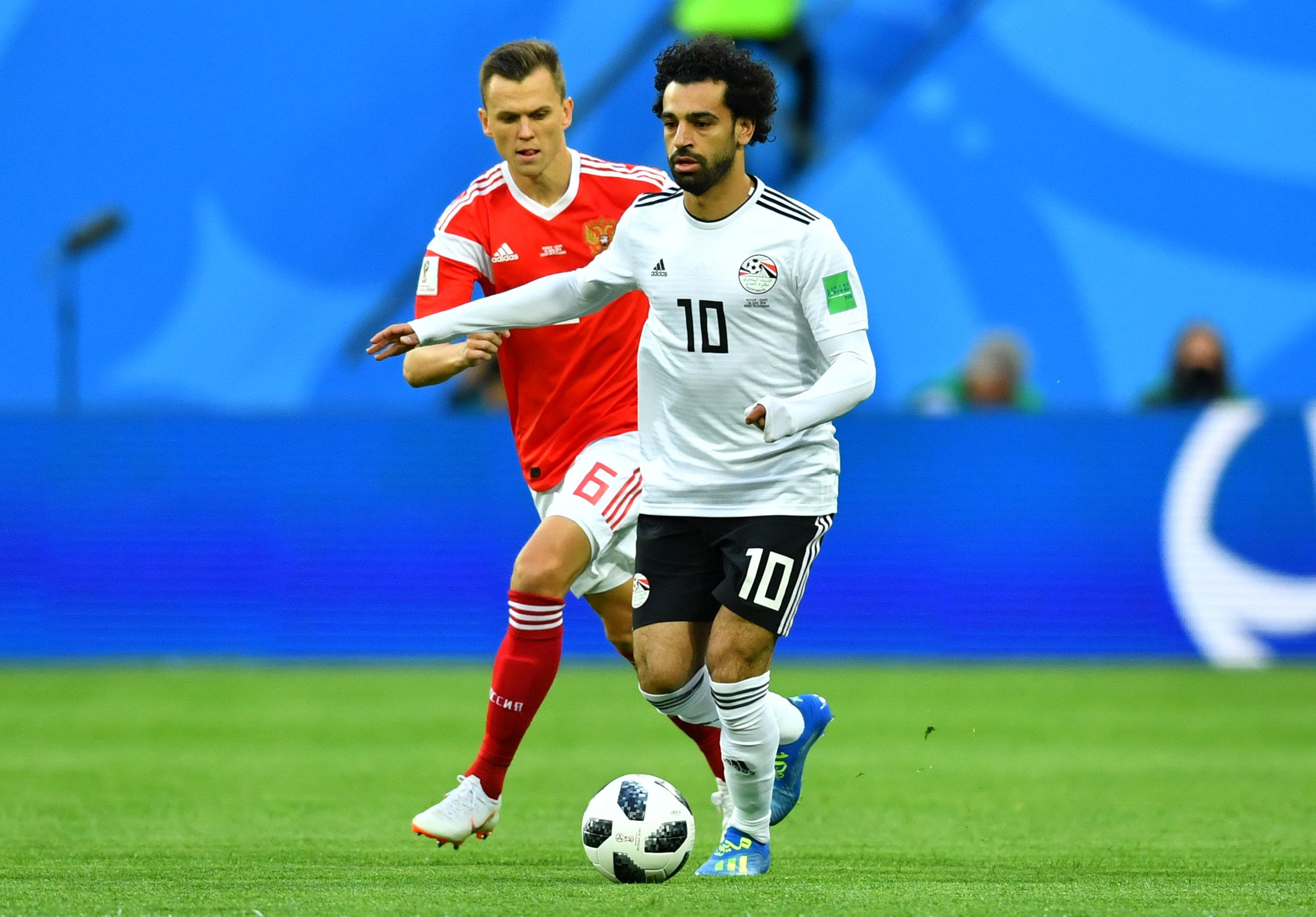 Gran expectativa había en todo el mundo por ver en acción al astro egipcio Mohamed Salah. Hasta la televisión rusa pasó en la previa un show de sus goles en el Liverpool y en la selección de su país. Había sumo respeto y se lo marcó hasta con reverencia. Zobnin estuvo siempre muy cerca suyo y cuando el volante idolatrado en su tierra y en la cuna de Los Beatles, podía eludirlo automáticamente tenía encima al zaguero Ignashevich. Falto de distancia por la inactividad que tuvo tras su lesión en la final de la Champions, el "10" poco pudo hacer. En el primer tiempo su aporte fue una media vuelta desde la puerta del área (41m.) que se fue lamiendo el poste. La presión asfixiante de los rusos lo obligaron a jugar lejos del arco. Después de la debacle del primer cuarto de hora del segundo tiempo su aporte fue mayor. Mejor rodeado entró más en juego, le hicieron el penal que luego convirtió y generó un par de opciones más. Expuso su calidad en pinceladas, pero no alcanzó para apagar el incendio.