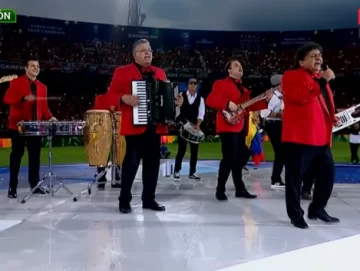 Vestidos con un traje rojinegro, los muchachos, como nos tienen acostumbrados, la rompieron en el centro de la cancha después de la actuación de La Vagancia, un grupo representativo de Independiente del Valle. "¡Estamos más nerviosos por el partido que por el show! Ya hemos tocado en lugares importantes y que nos han puesto nerviosos pero el partido, esta final histórica, nos tiene más nerviosos”, le había contado Marcos Camino a Olé, quien estuvo a cargo del acordeón.