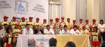 Carlos Gómez, presidente de la ONG que sienta sus reales en Chimbas, y José Díaz, secretario general del gremio provincial, junto al intendente de Chimbas, Mario Tello, Juan José Igualada, representando a la Casemi, y Ricardo Heredia, propietario de Luna Morena, presidieron una mesa que también compartieron Luciano Montivero, capitán del equipo, Daniel "Pitufo" Castro, técnico, y Roberto "Fido" Galván, responsable de deportes de la entidad.