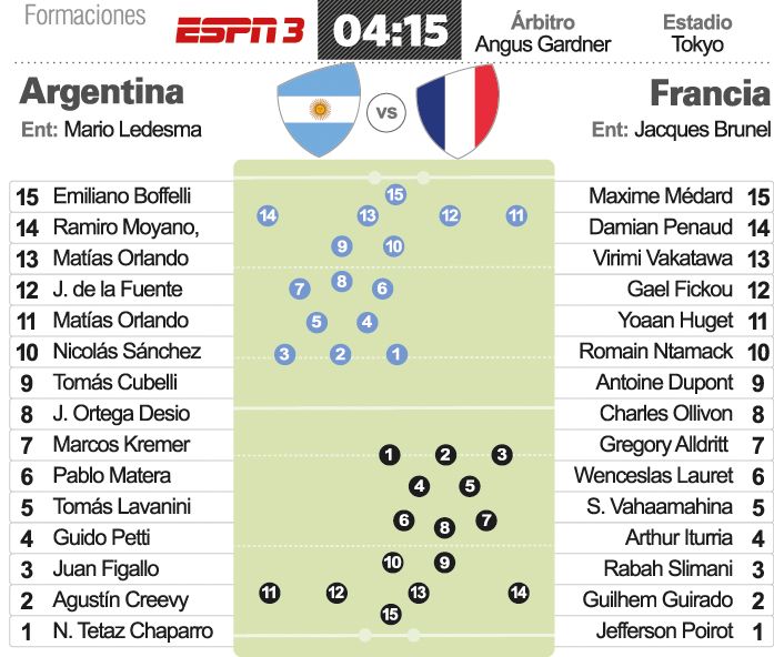 El seleccionado de rugby de la Argentina, Los Pumas, que sufre una serie de nueve derrotas consecutivas, la peor de su historia, se jugará parte de su futuro en la IX Copa del Mundo que se celebra en Japón cuando en la madrugada de este sábado debute ante Francia, por el Grupo C del certamen. El partido comenzará mañana a las 4.15 de nuestro país, en el Tokyo Stadium, de la capital japonesa, con el arbitraje del australiano Angus Gardner y será televisado por ESPN 2.