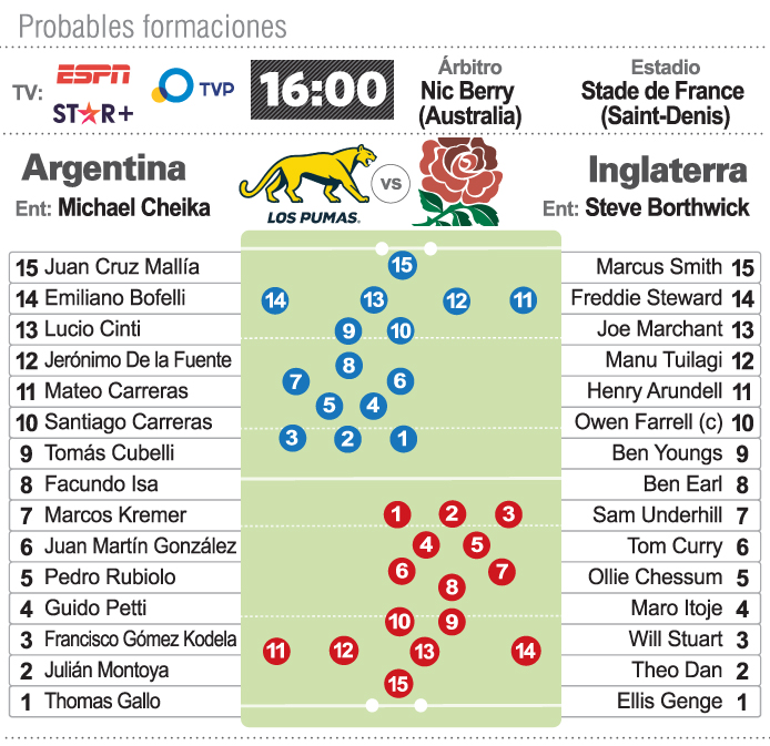 El seleccionado argentino de rugby, Los Pumas, enfrentará hoy a su par de Inglaterra desde las 16 (hora de la Argentina) por el tercer puesto del Mundial de Francia 2023. Jugarán en el Stade de France, del norteño suburbio parisino Saint-Denis y será dirigido por el árbitro Nick Berry de Australia y televisado por la señal ESPN. Los Pumas disputarán la revancha frente al subcampeón mundial vigente, con el que perdieron en el debut del Mundial por 27-10. De esta manera, el equipo argentino buscará alcanzar la medalla de bronce, que ya obtuvo en la Copa del Mundo 2007, también disputada en Francia.