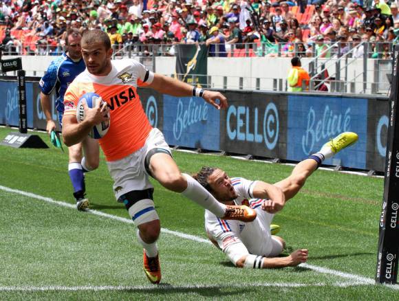El seleccionado dirigido por Santiago Gómez Cora inició la jornada con una victoria sobre Francia por 14 a 7 (tries de Moyano y Palma, y con dos conversiones de Revol), y luego fue superado ampliamente por Sudáfrica, a la postre el campeón (superó en la final 17-14 a Nueva Zelanda) en semifinales por 31-0. El sábado había resultado ideal para Los Pumas pues habían ganado sus tres encuentros. La clasificación general del Circuito Mundial de Seven es liderada por Nueva Zelanda, con 58 puntos; seguido por Sudáfrica, con 56, y Fiji, con 48. La Argentina marcha sexta, con 33 unidades, producto de los 5 puntos sumados en Australia, los 13 de Dubai y los 15 que reunió en Port Elizabeth. La cuarta etapa del IRB Seven World Series se llevará a cabo en Las Vegas, del 24 al 26 de enero de 2014.