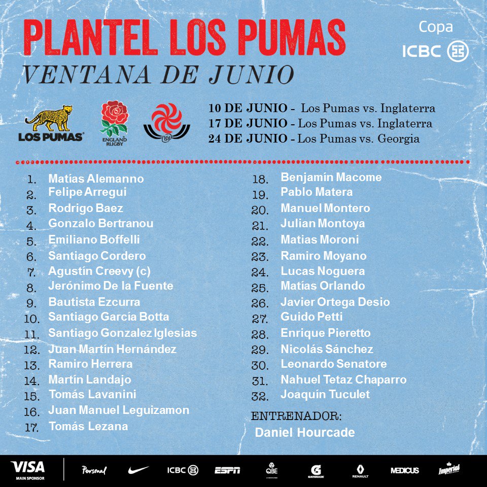 El Head Coach de Los Pumas, Daniel Hourcade confirmó la lista de 32 convocados que estarán disponibles para disputar los partidos correspondientes a la ventana de junio, en los cuales Argentina se medirá ante Inglaterra (10 y 17 en San Juan y Santa Fe, respectivamente) y Georgia (24 de junio en Jujuy).