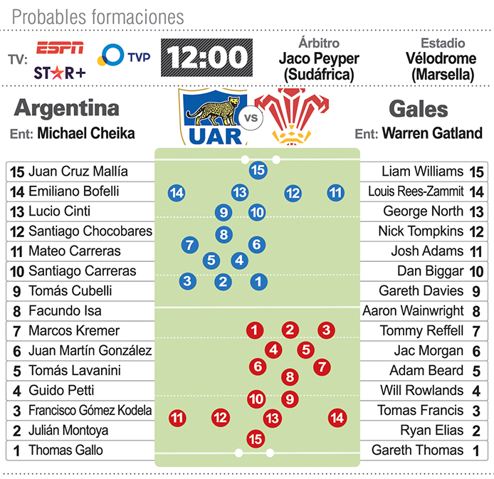 El encuentro de cuartos de final se jugará este sábado en el Stade de Marseille, desde las 12 (hora de la Argentina), con el arbitraje del sudafricano Jaco Peyper, con el cual Los Pumas tiene un récord de cuatro triunfos y 10 reveses, y televisado por ESPN y la TV Pública.