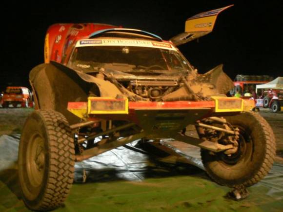 Casi las 3 de la tarde del miércoles 5 de enero. Comenzaba el cuarto día de competencia. Exactamente las 14h.59m. de ayer. El binomio sanjuanino Lino/Juan Pablo Sisterna debía largar, pero no lo pudo hacer ya que rompió el motor del Buggy y padre e hijo abandonaron la carrera más difícil y exigente del mundo. De esta manera se les termina el sueño a los sanjuaninos, que se habían propuesto mejorar la performance conseguida el año pasado. Hoy al mediodía llegan a la provincia y traen el Buggy.
