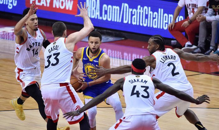 Stephen Curry, el genio de los Golden State Warriors, rodeado por jugadores de Toronto Raptors.