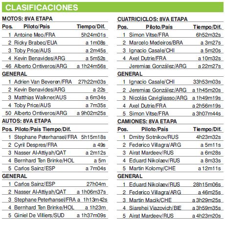 El cordobés Federico Villagra en camiones, el salteño Kevin Benavides en motos y Jeremías González Ferioli (Córdoba) en cuatriciclos son escoltas en sus respectivas categorías al completarse ayer la octava etapa del Rally Dakar 2018, que se corrió entre Uyuni y Tupiza de Bolivia, y son los argentinos más destacados. Villagra fue segundo en la etapa entre los camiones, aventajando al líder de la clasificación general, el ruso Eduard Nikolaev (Kamaz) por 3m22s. El trabajo de Benavides en motos (Honda) está siendo muy regular a lo largo de toda la competencia, en la especial de ayer quedó en el cuarto lugar, pero le alcanzó para recortarle poco menos de tres minutos al líder, el francés Adrien Van Beveren (Yamaha), que finalizó en la séptima colocación de la jornada.