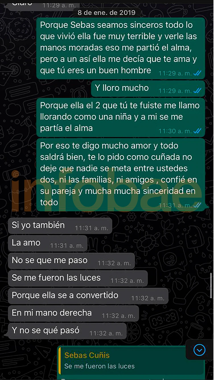 Otro chat fuerte data del 8 de enero del año pasado. Allí, Cynthia nuevamente habla con Villa después de otra pelea, en la que denuncia que Daniela terminó herida. “Porque Sebas, seamos sinceros, todo lo que vivió ella fue muy terrible y verle las manos moradas, eso me partió el alma. Pero aún así ella me dice que te ama y que tú eres un buen hombre. Y lloró mucho. Por eso te digo mucho amor y todo saldrá bien, te lo pido como cuñada, no deje que nadie se meta entre ustedes dos, ni la familia, ni los amigos, confíe en su pareja y mucha, mucha sinceridad en todo”, le dice. “Sí, yo también la amo, no sé qué me pasó, se me fueron las luces. Porque ella se ha convertido en mi mano derecha y no sé que pasó”, acepta el jugador.